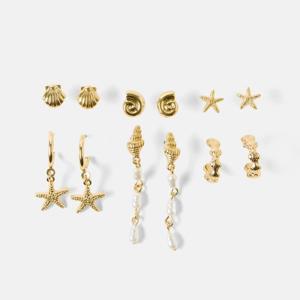 6 Pack Beach Stud and Hoop Earrings - Gold Tone