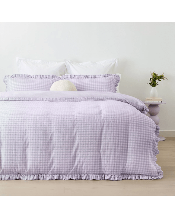 Gingham Ruffle Cotton Quilt Cover Set - Double Bed, Lilac
